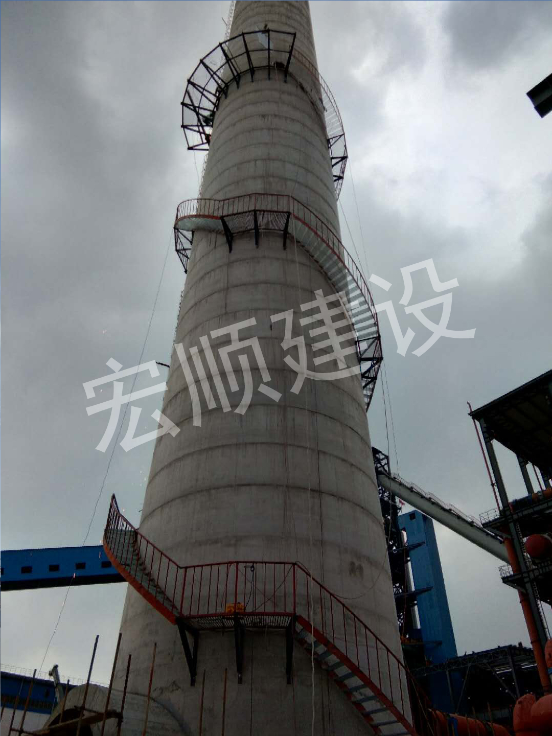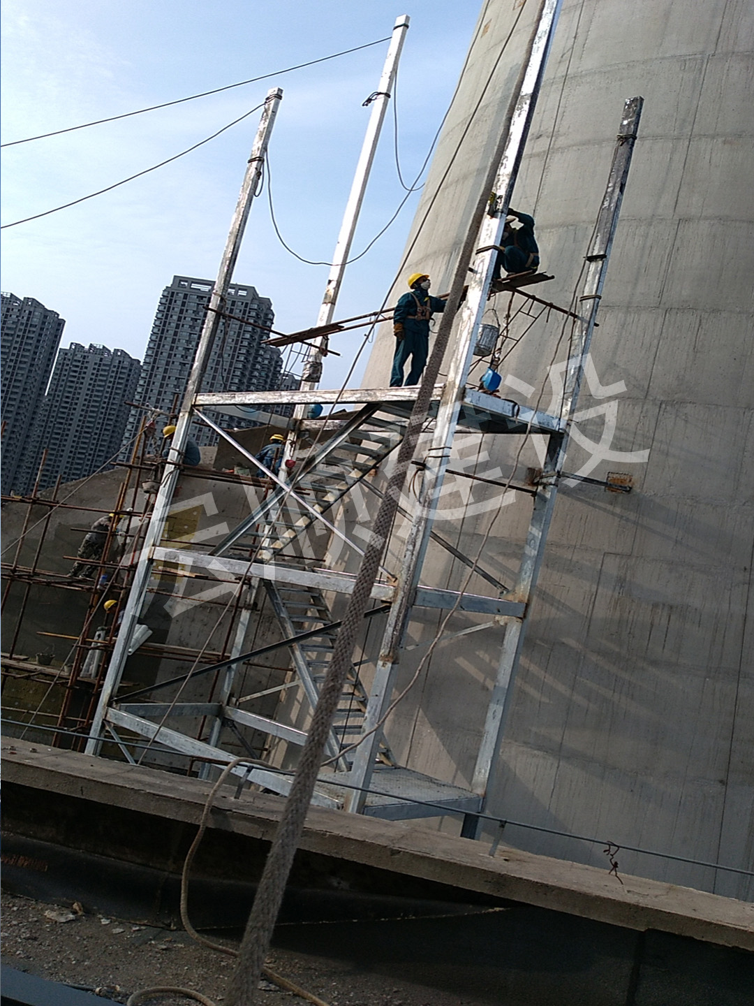 2、對80米煙囪身從下向上依次焊接安裝,將第一塊踏步板焊接在囪身后,就依第一塊板為作業平臺依次向上逐步焊接安裝。同時準備兩臺焊機,一臺焊接負責焊接安裝踏步板,另一臺負責焊接欄桿及加固用。
